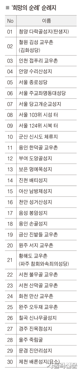 인천·수원·의정부교구에는 ▲인천교구 접푸리 교우촌 ▲수원교구 안양 수리산성지 ▲수원교구 용인 손골성지 ▲수원교구 용인 한덕골 교우촌 ▲황해도 교우촌(의정부교구 참회와속죄의성당)의 5곳 순례지가 포함돼 있다.
